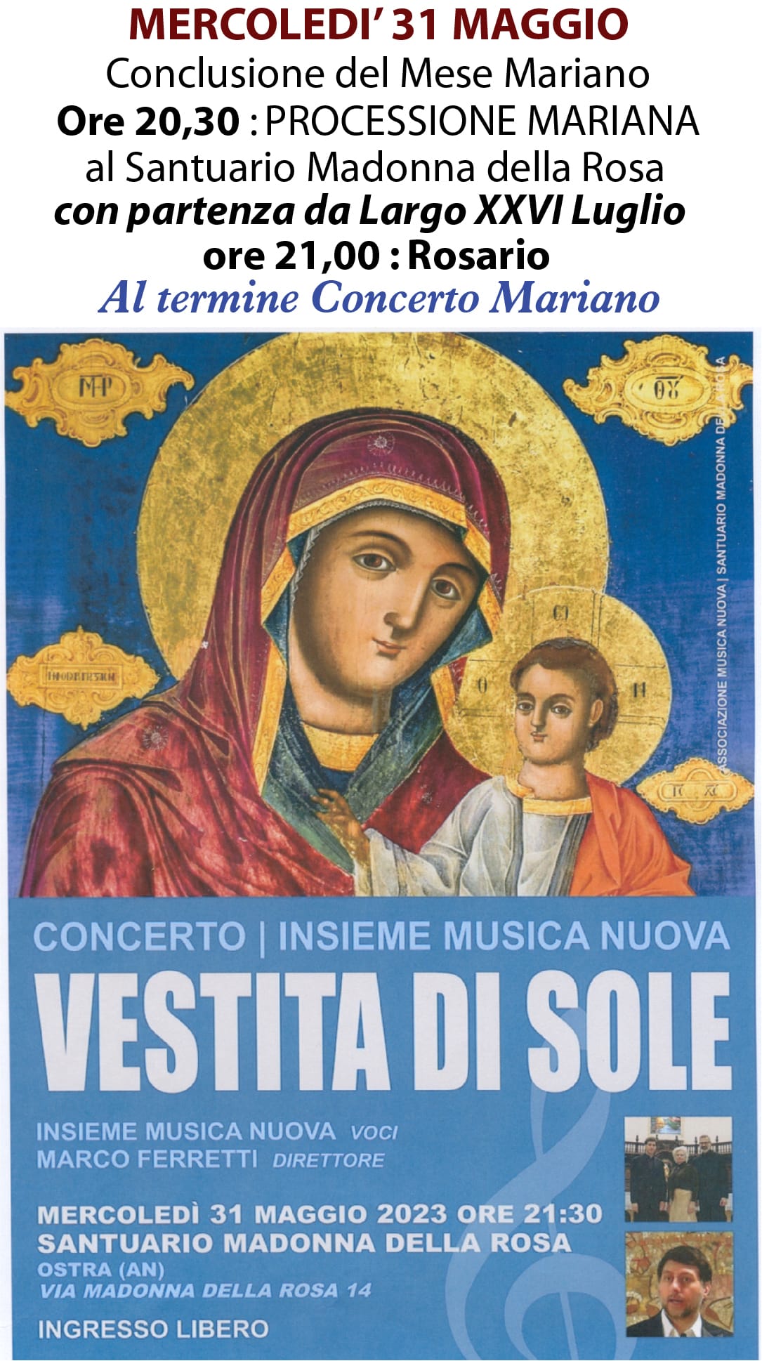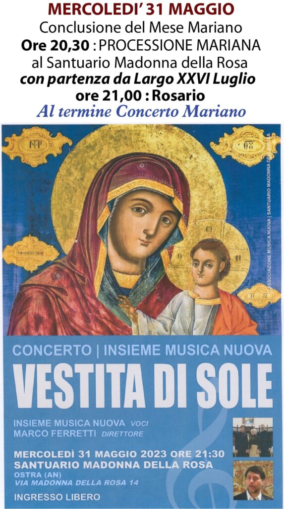 Chiusura Mese Mariano Il 31/05/2023 la Comunità di Ostra conclude il Mese Mariano con una processione al Santuario Madonna della Rosa ed un concerto Mariano del gruppo Insieme Musica Nuova diretto dal maestro Marco Ferretti