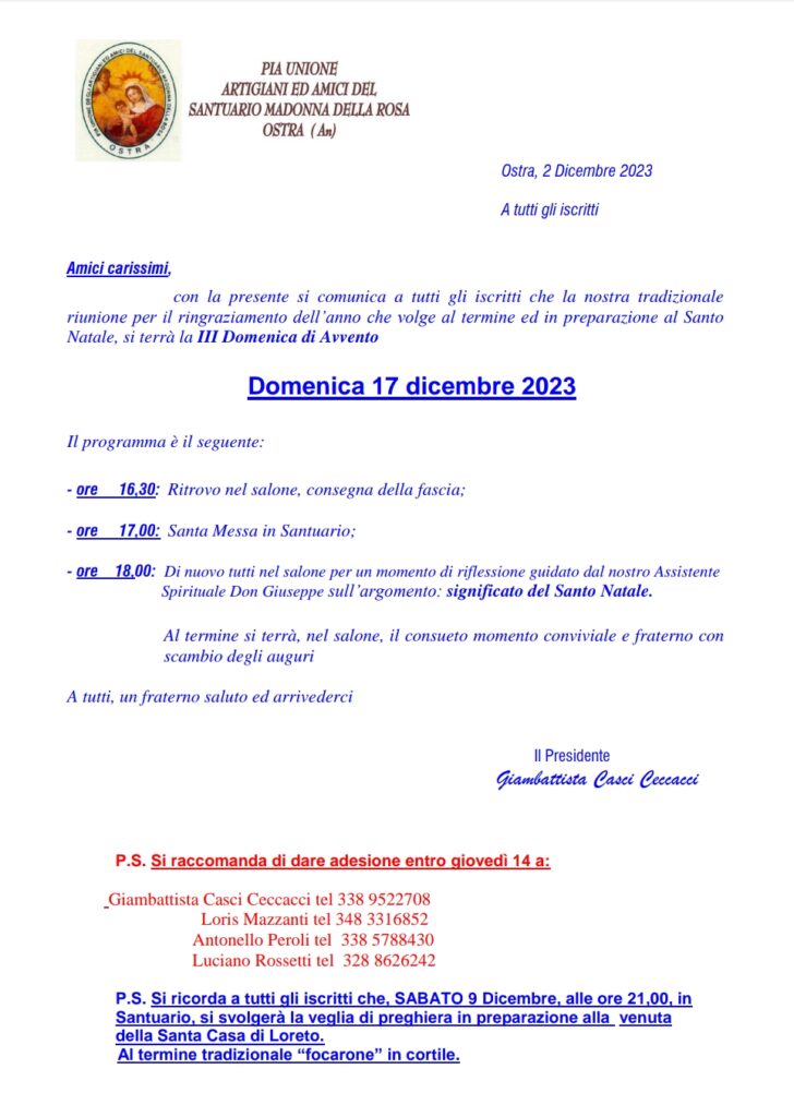 Incontro di Avvento Il 17 dicembre 2023 gli amici della Pia Unione si incontrato per ringraziare dell’anno che si sta chiudendo e per prepararsi al Santo Natale con l’Assistente Spirituale don Giuseppe